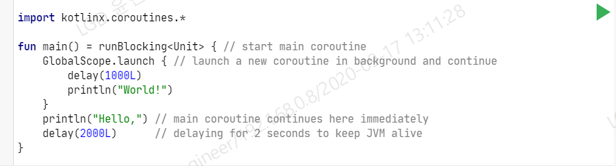 GlobalScope(GlobalScope) : GlobalScope 는 CoroutineScope 의 한 종류이며, 미리 정의된 방식으로 프로그램 전반에 걸쳐 백그라운드 에서 동작