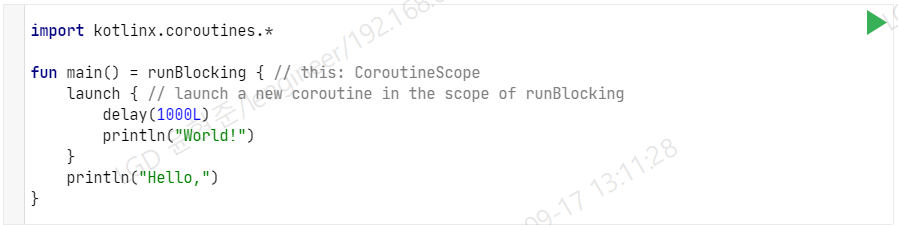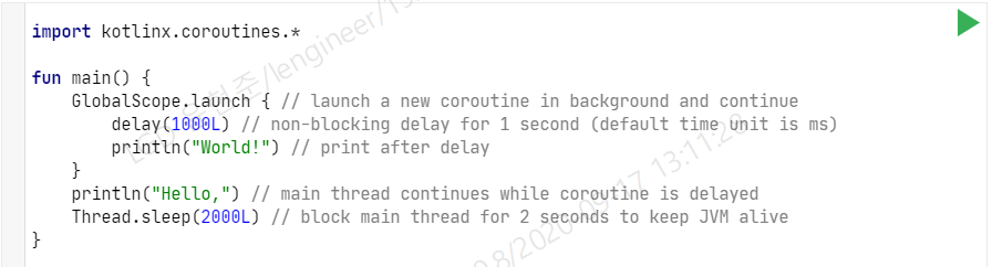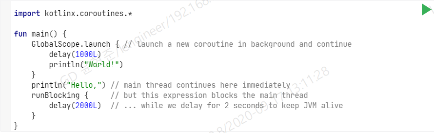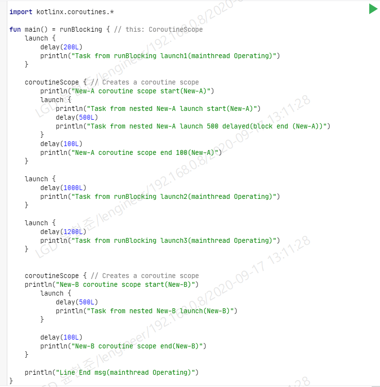 4> 위 코드에서 global scope 안의 코루틴은 non blocking이고, Thread.sleep은 blocking 방식임을 참고하라.