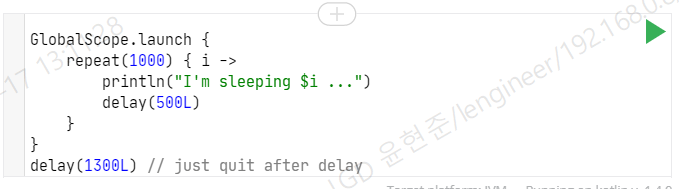위 코드는 장기간 동작하는 코루틴을 glboalscope에 launch한다. 나는 잠온다는 말을 0.5초 주기로 프린팅하고, 메인 함수로 리턴한다.