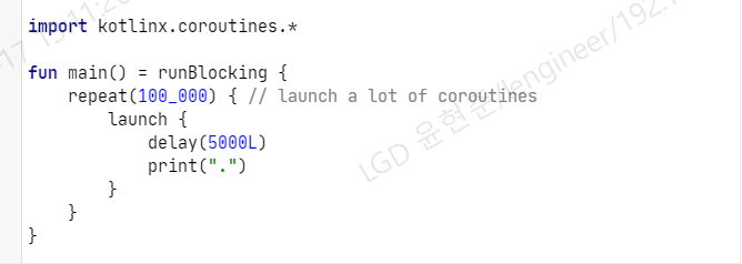 1> 위 코드는 코루틴이 light weight임을 보여주는 코드이다. 저 코드를 쓰레드로 구현한다고 생각해본다면.. oom과 관련한 에러가 나게 될 것이다. 하지만 코루틴은 경량이기 때문에 저렇게 구성해도 메모리 관련 오류가 나지않는다.