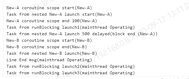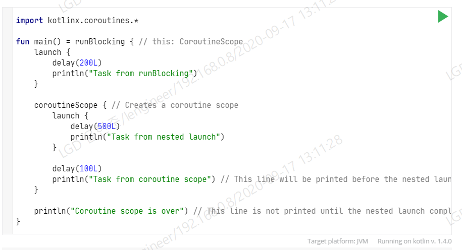 (coroutineScope가 아직 완료되지 않은 경우에도 "Task from coroutine scope"메시지 (중첩 된 시작을 기다리는 동안) 바로 뒤에 "Task from runBlocking"이 실행되고 표시된다)
