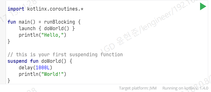 4> 이 예제는 main에서, 코루틴빌더인 runBlocking을 사용하여 코루틴으로 변환해주는 함수가 있다.