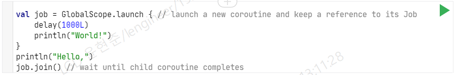 join(join): Join() 함수로 코루틴 블록이 완료될 때까지 다음 코드 수행을 대기 할 수 있다.