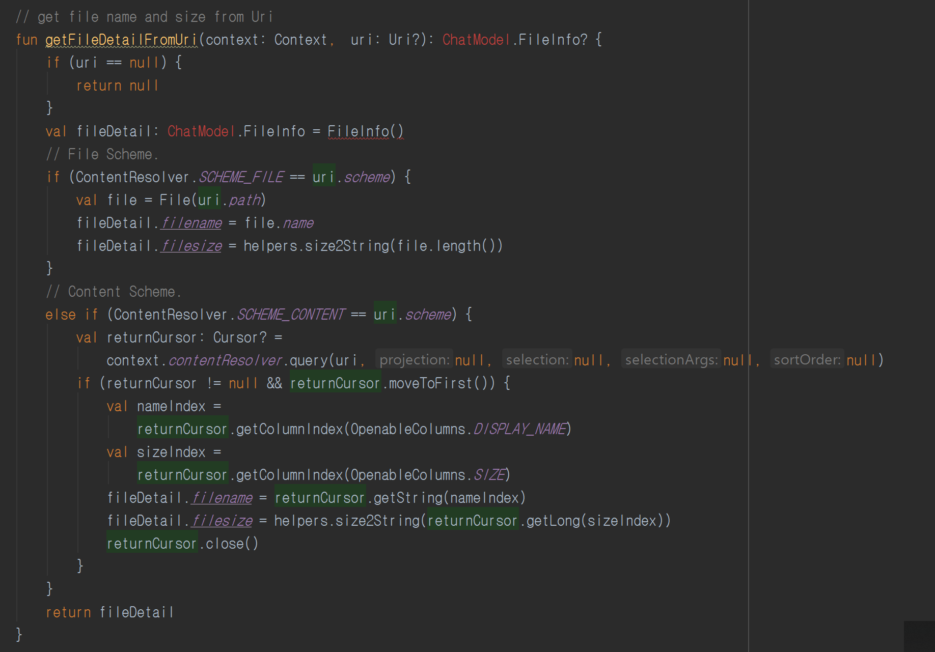 val fileinfo: ChatModel.FileInfo? = getFileDetailFromUri(context!!, fileUri)