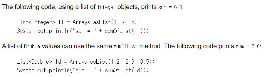 sumOfList는 Number타입의 어떤 것이라도 받아서 double로 처리하고 멤버 s에 누적하여 double을 리턴하는 함수다.