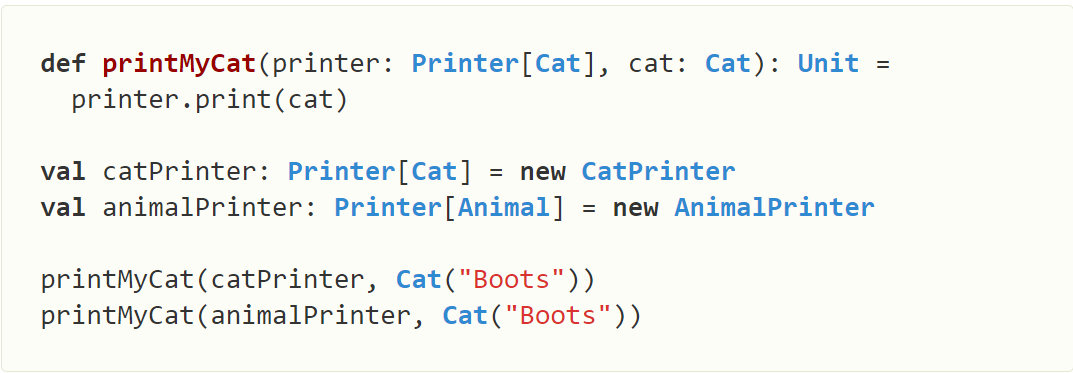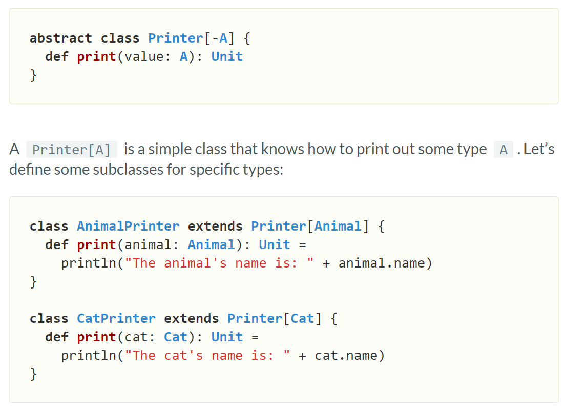If a Printer[Cat] knows how to print any Cat to the console, and a Printer[Animal] knows how to print any Animal to the console, it makes sense that a Printer[Animal] would also know how to print any Cat. The inverse relationship does not apply, because a Printer[Cat] does not know how to print any Animal to the console. Therefore, we should be able to use a Printer[Animal] in place of Printer[Cat], if we wish, and making Printer[A] contravariant allows us to do exactly that.