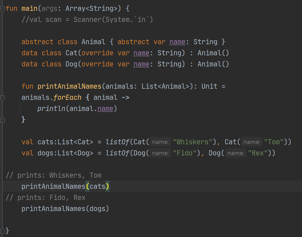 In the following example, the method printAnimalNames will accept a list of animals as an argument and print their names each on a new line. If List[A] were not covariant, the last two method calls would not compile, which would severely limit the usefulness of the printAnimalNames method.