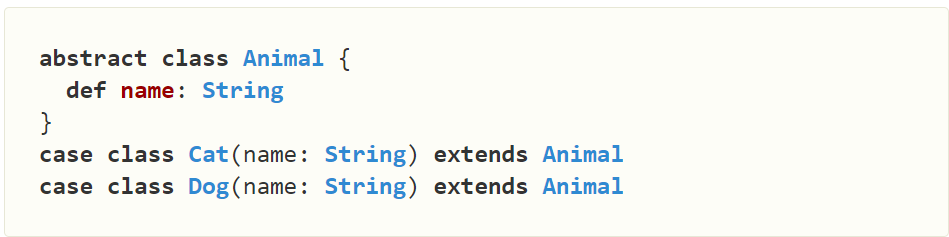 Both Cat and Dog are subtypes of Animal. The Scala standard library has a generic immutable sealed abstract class List[+A] class, where the type parameter A is covariant. This means that a List[Cat] is a List[Animal] and a List[Dog] is also a List[Animal]. Intuitively, it makes sense that a list of cats and a list of dogs are each lists of animals, and you should be able to use either of them for in place of List[Animal]