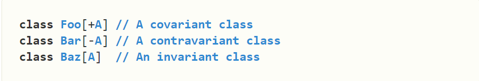 A type parameter A of a generic class can be made contravariant by using the annotation -A. This creates a subtyping relationship between the class and its type parameter that is similar, but opposite to what we get with covariance. That is, for some class Writer[-A], making A contravariant implies that for two types A and B where A is a subtype of B, Writer[B] is a subtype of Writer[A].