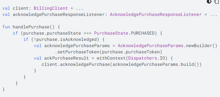 다음 예는 Google Play 결제 라이브러리를 사용하여 구매를 확인하는 방법을 보여줍니다.