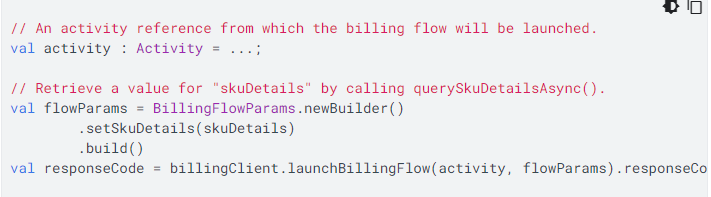 이 메서드는 querySkuDetailsAsync() 호출에서 얻은 관련 SkuDetails 객체가 포함된 BillingFlowParams 객체를 참조한다.