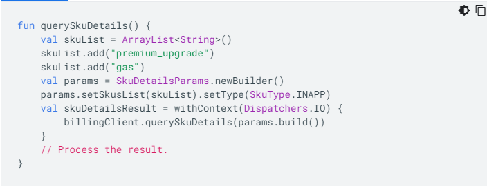 querySkuDetailsAsync()를 호출할 때 SkuType과 함께 Google Play Console에서 생성된 제품 ID 문자열 목록을 지정하는 SkuDetailsParams의 인스턴스를 전달.