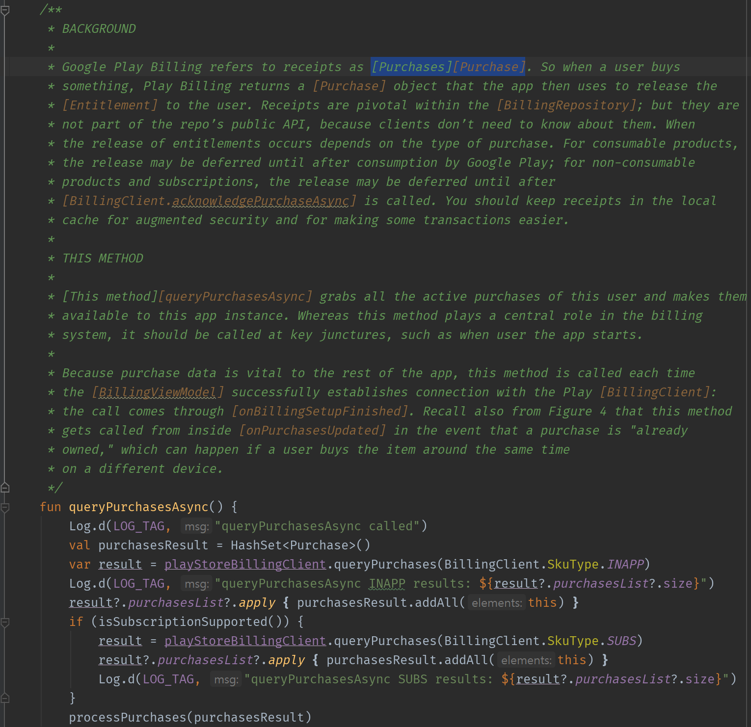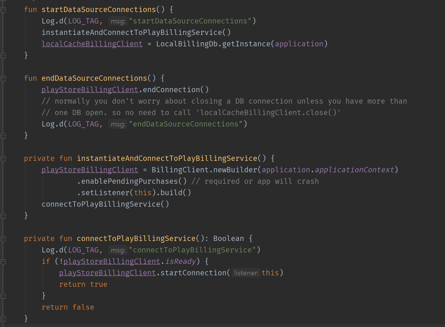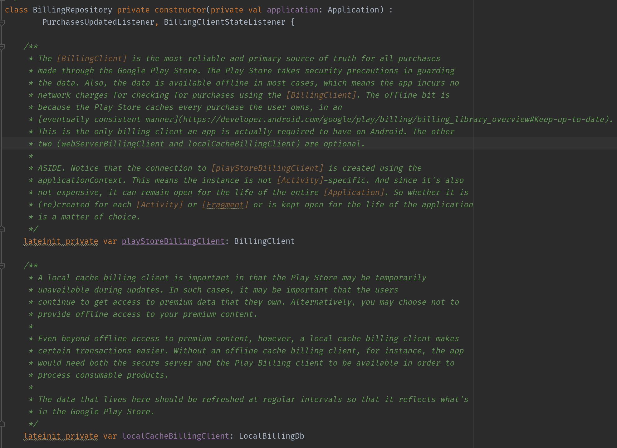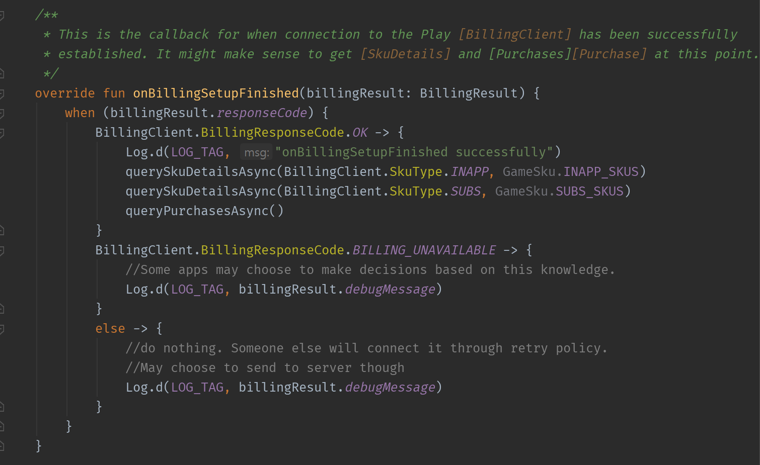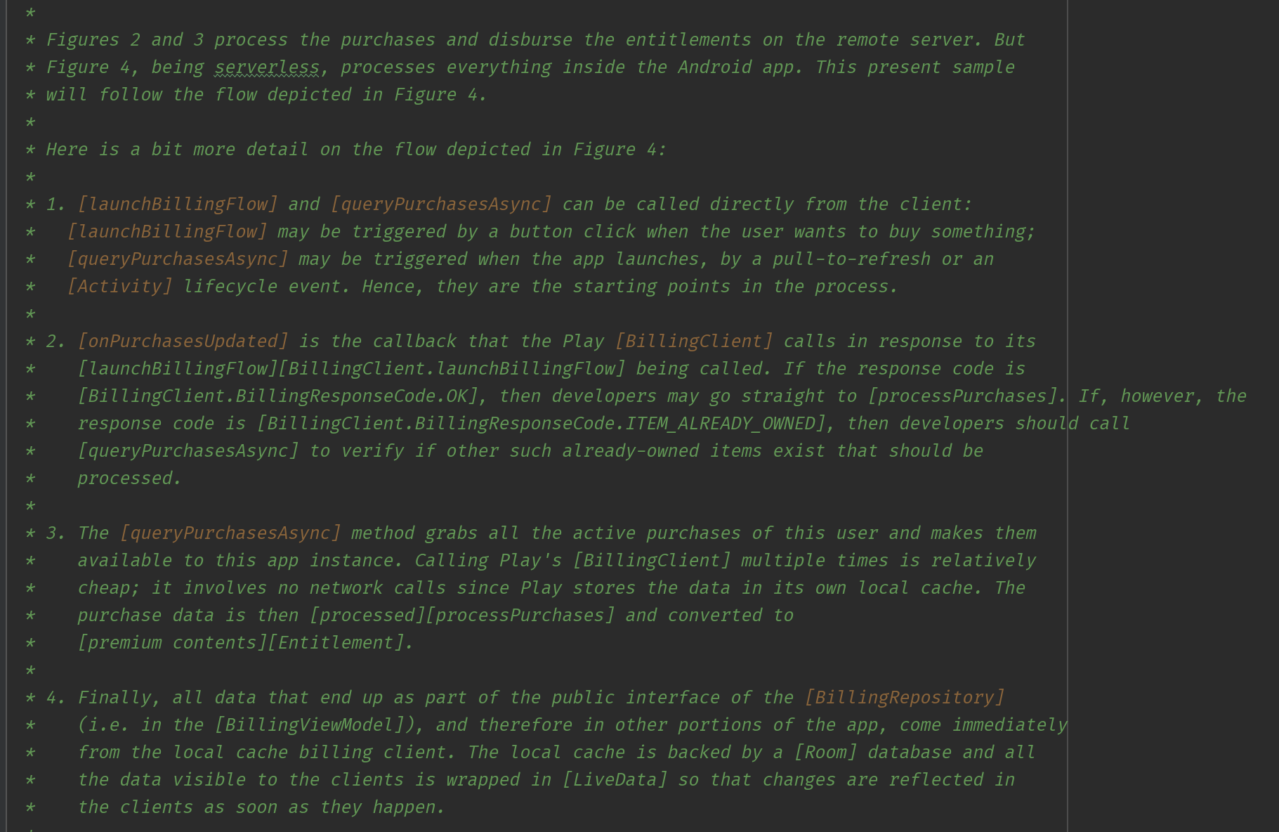 구매 데이터는 앱의 나머지 부분에 중요하므로 [BillingViewModel]이 Play [BillingClient]와 성공적으로 연결될 때마다이 메서드가 호출됩니다.