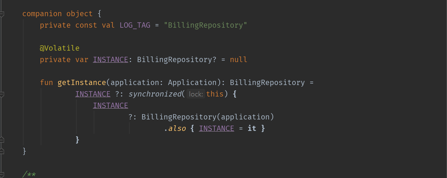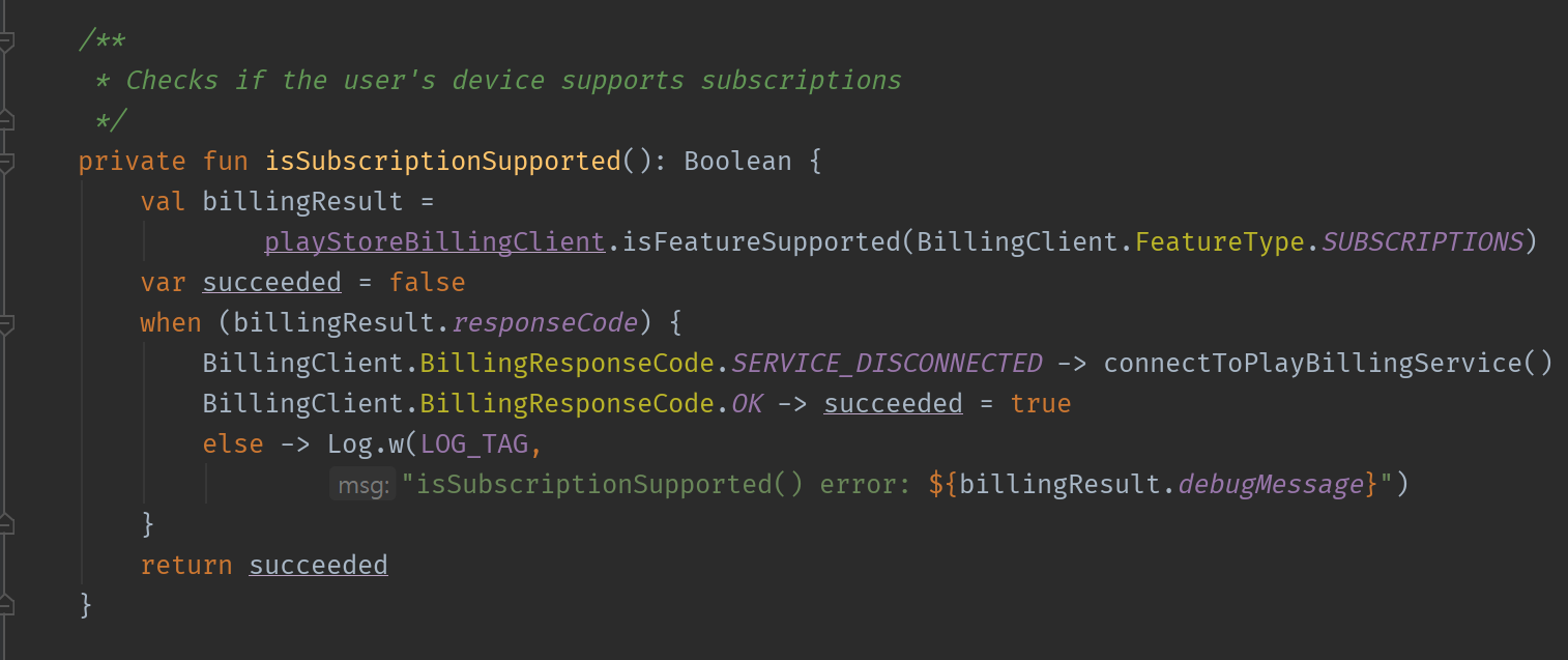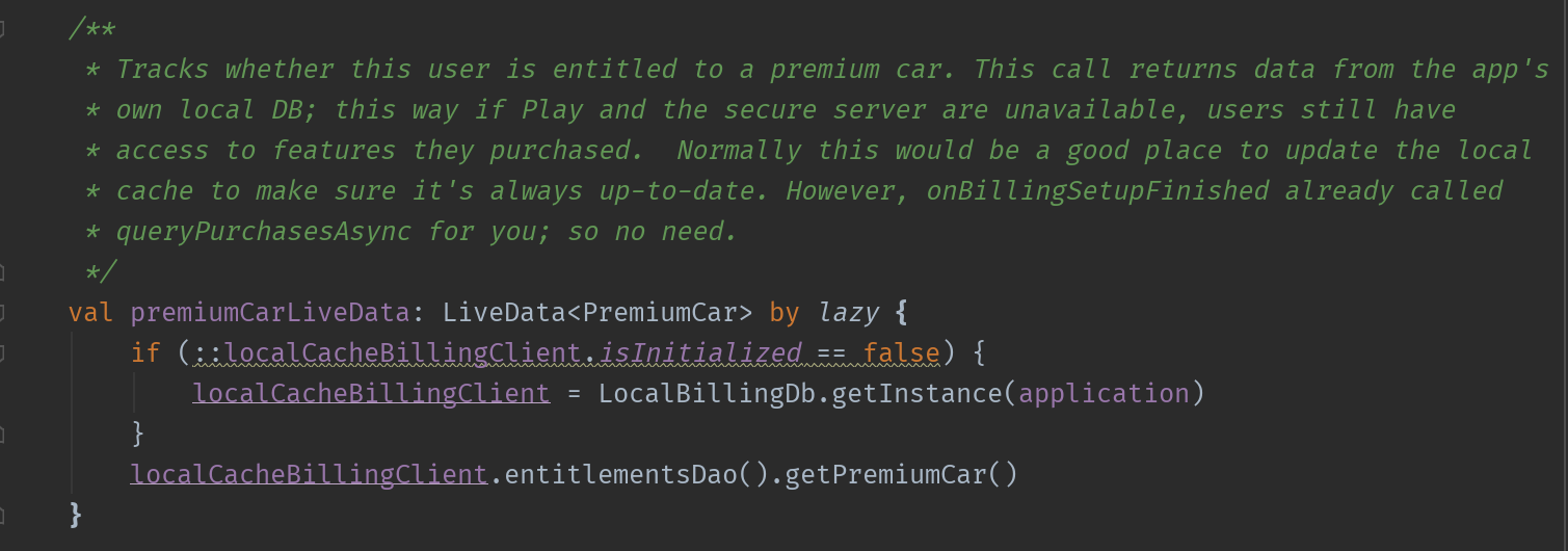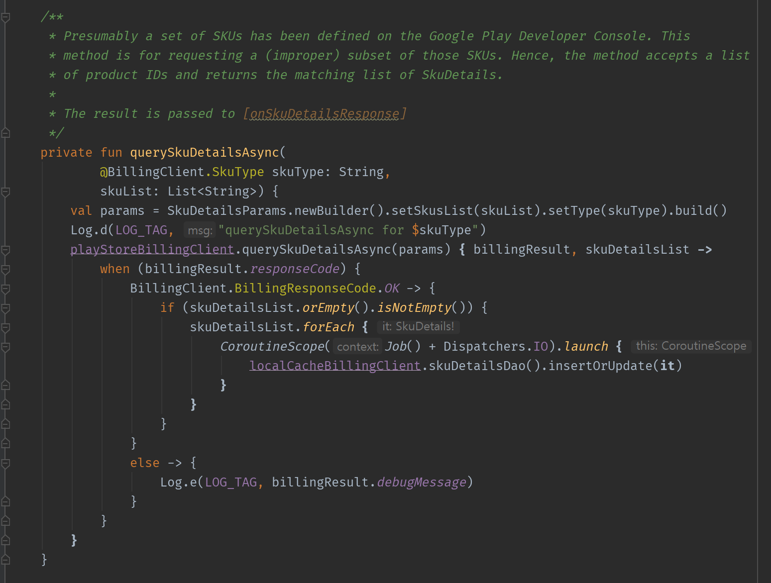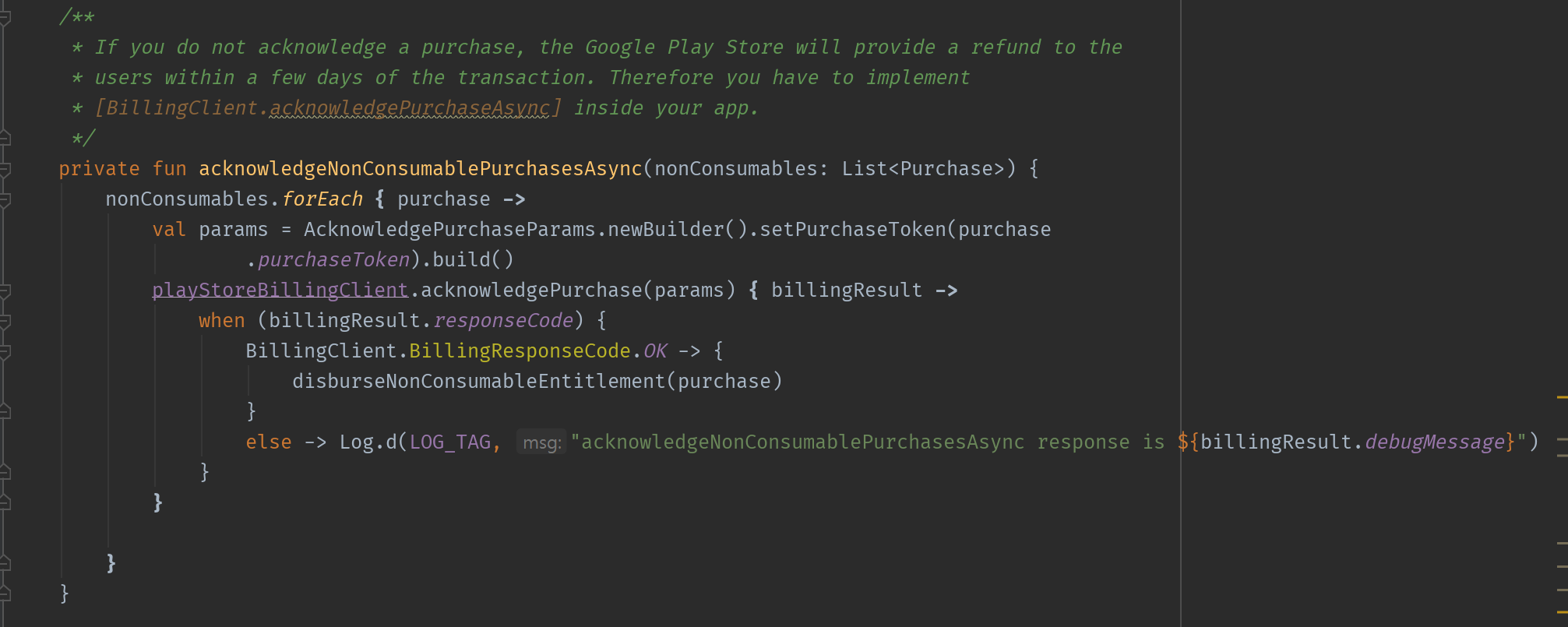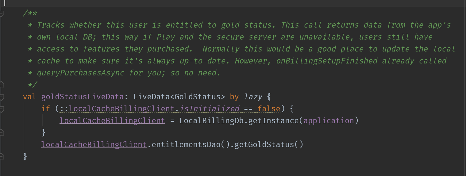 구매 데이터는 앱의 나머지 부분에 중요하므로 [BillingViewModel]이 Play [BillingClient]와 성공적으로 연결될 때마다이 메서드가 호출됩니다.