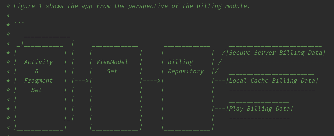 이 모듈을 [BillingRepository]라고합니다. 그리고이 모듈은 _Play 결제 라이브러리 __Play Billing Library_, 보안 서버의 결제 부분, 앱 로컬 캐시의 결제 부분과의 모든 상호 작용을 처리합니다.