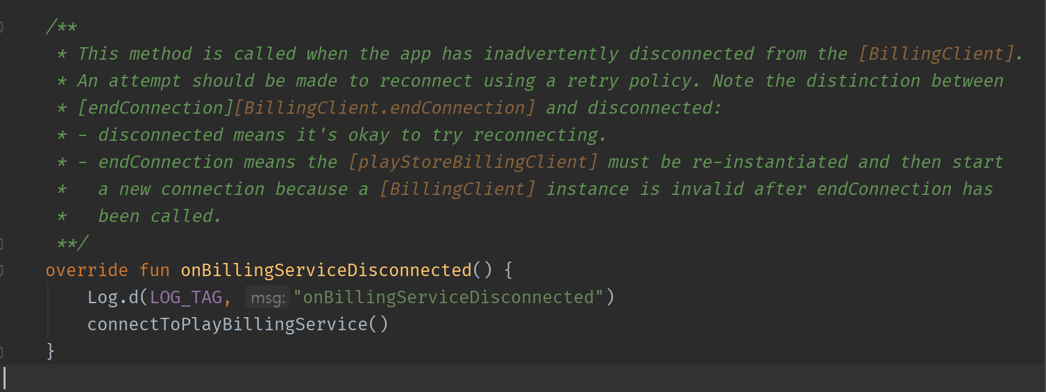 -endConnection은 endConnection이 호출 된 후 [BillingClient] 인스턴스가 유효하지 않기 때문에 [playStoreBillingClient]를 다시 인스턴스화 한 다음 새 연결을 시작해야 함을 의미합니다.