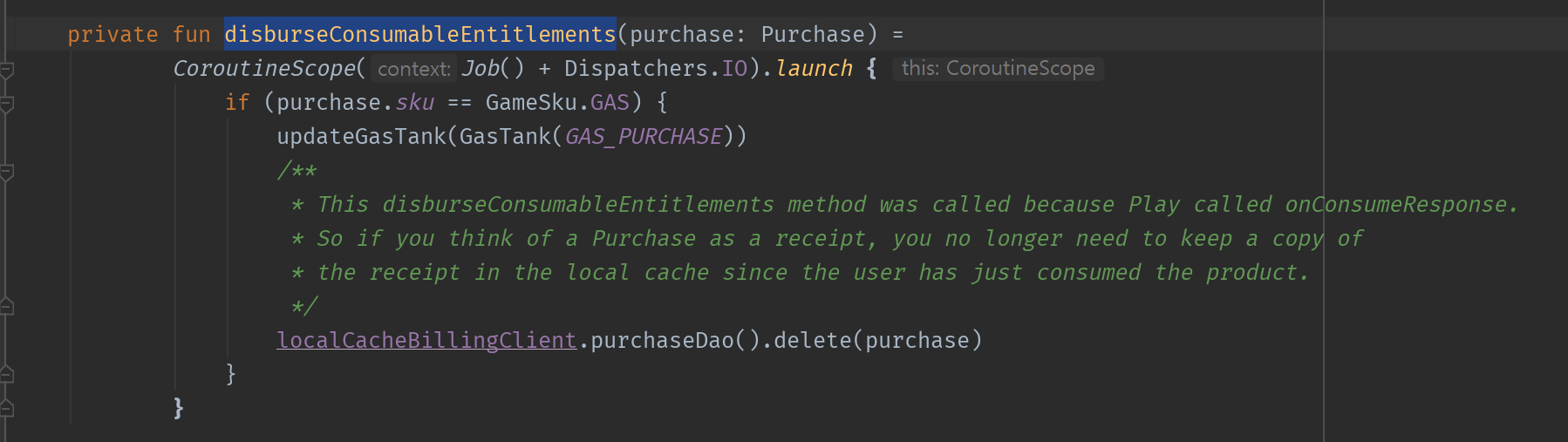 Play가 onConsumeResponse를 호출했기 때문에이 disburseConsumableEntitlements 메소드가 호출되었습니다.