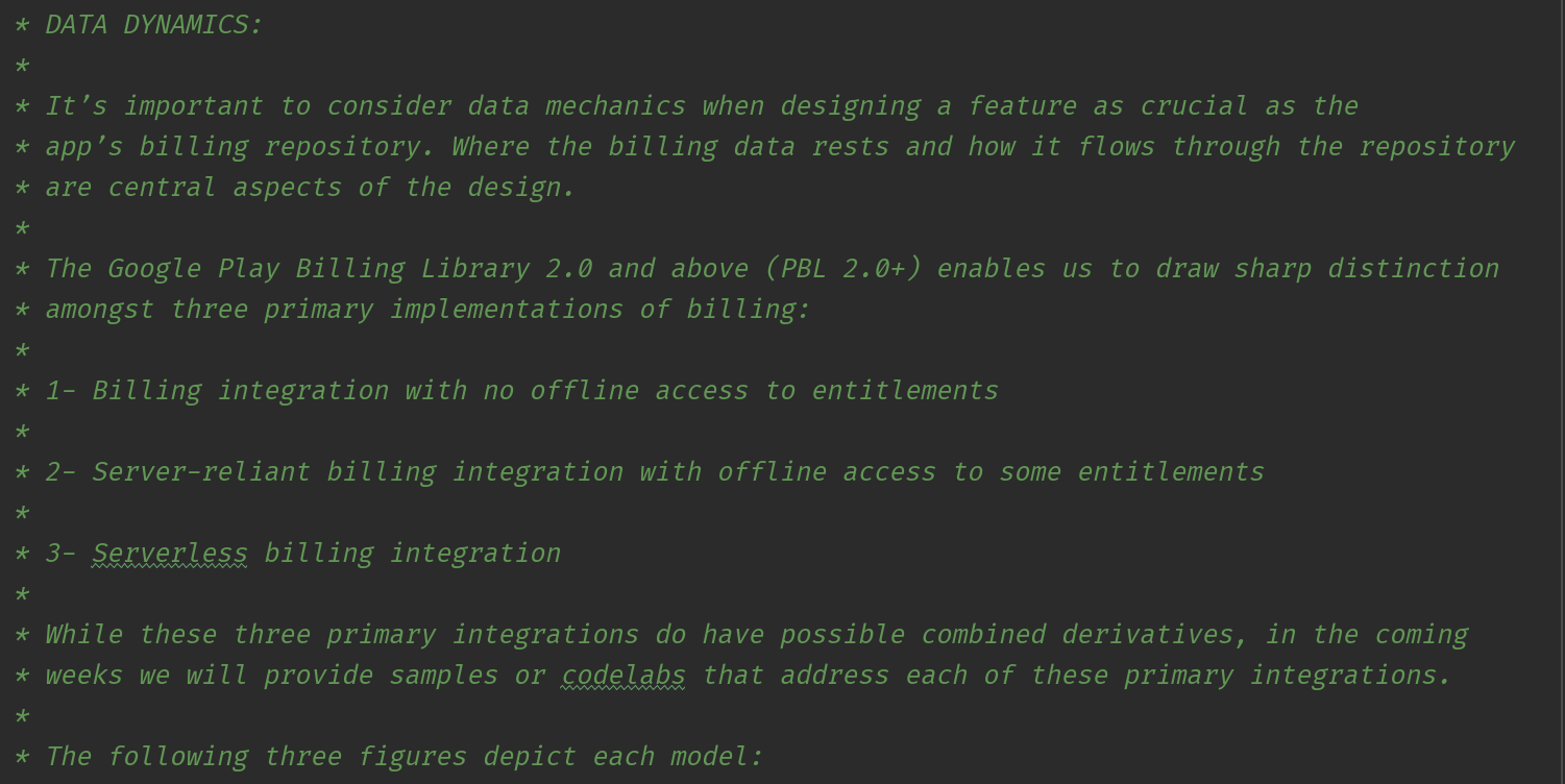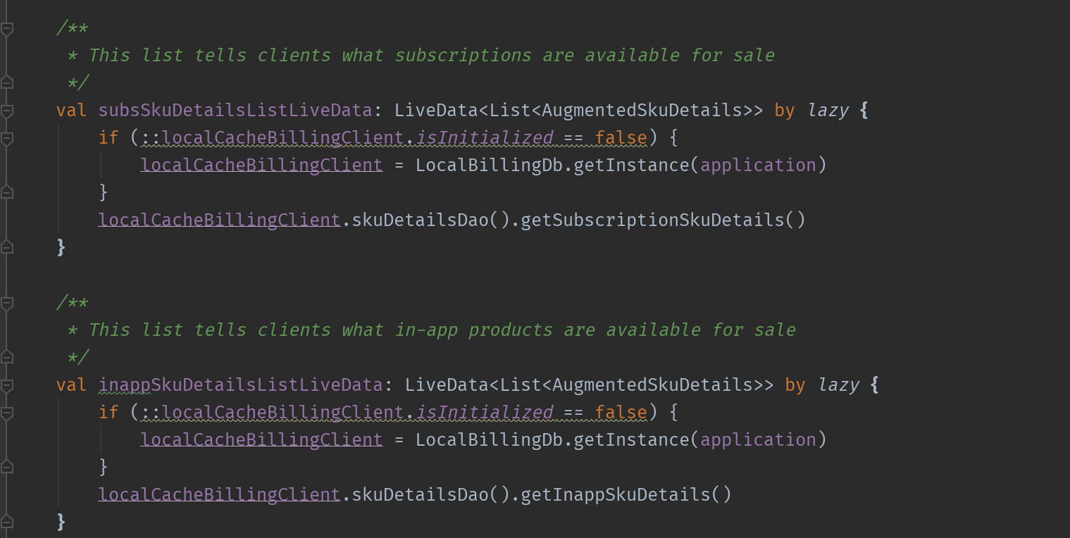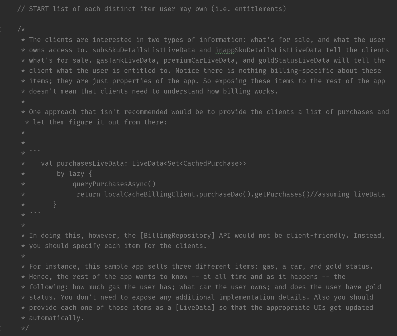 클라이언트는 "무엇을 판매할 지"와 "사용자가 액세스 할 수있는 정보"의 두 가지 유형에 관심이 있습니다. subsSkuDetailsListLiveData 및 inappSkuDetailsListLiveData는 클라이언트에게 "무엇을 판매할 지"를 알려줍니다.