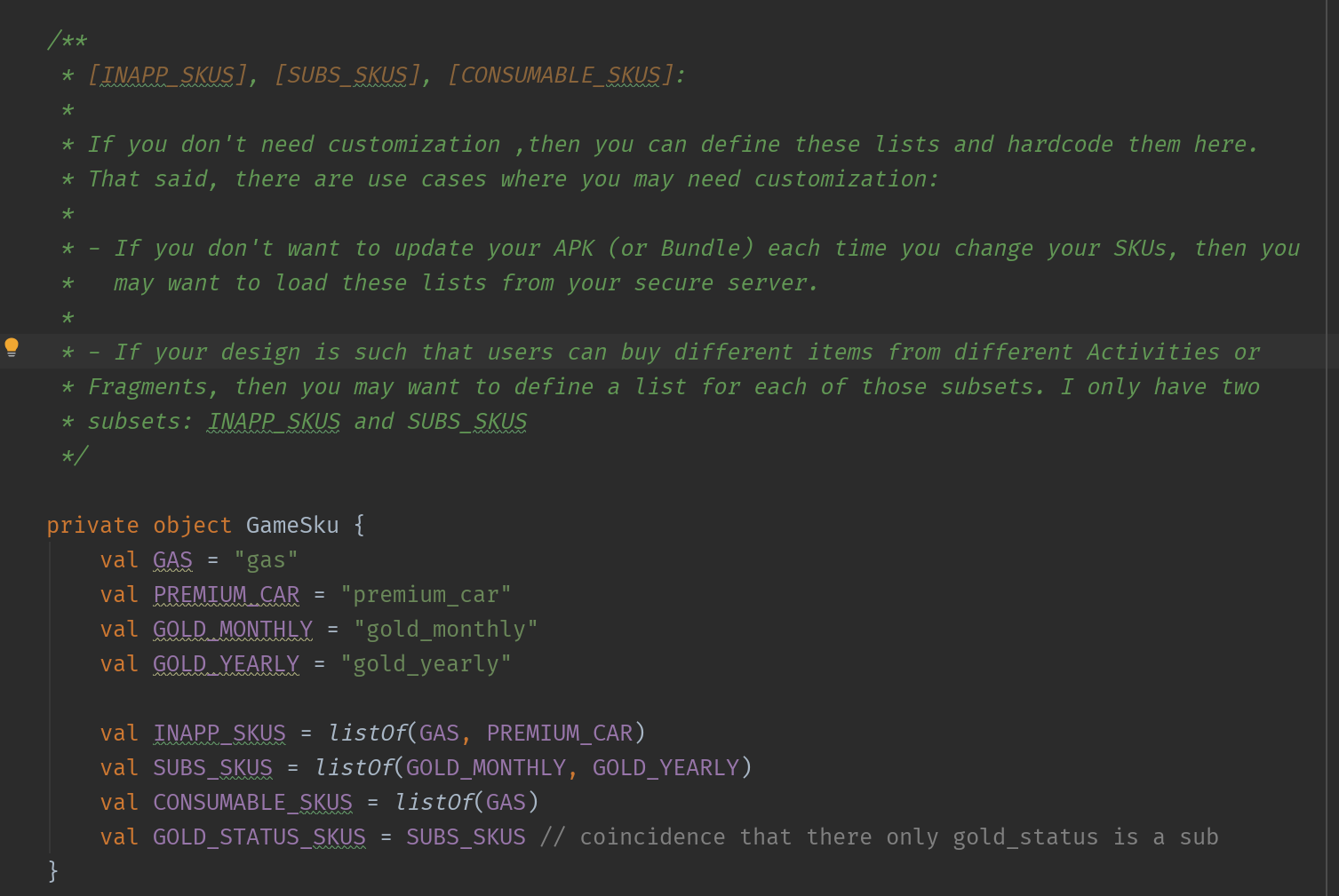 - 사용자가 다른 활동 또는 조각에서 다른 항목을 구입할 수있는 디자인 인 경우 각 하위 집합에 대한 목록을 정의 할 수 있습니다. INAPP_SKUS 및 SUBS_SKUS의 두 하위 집합 만 있습니다.