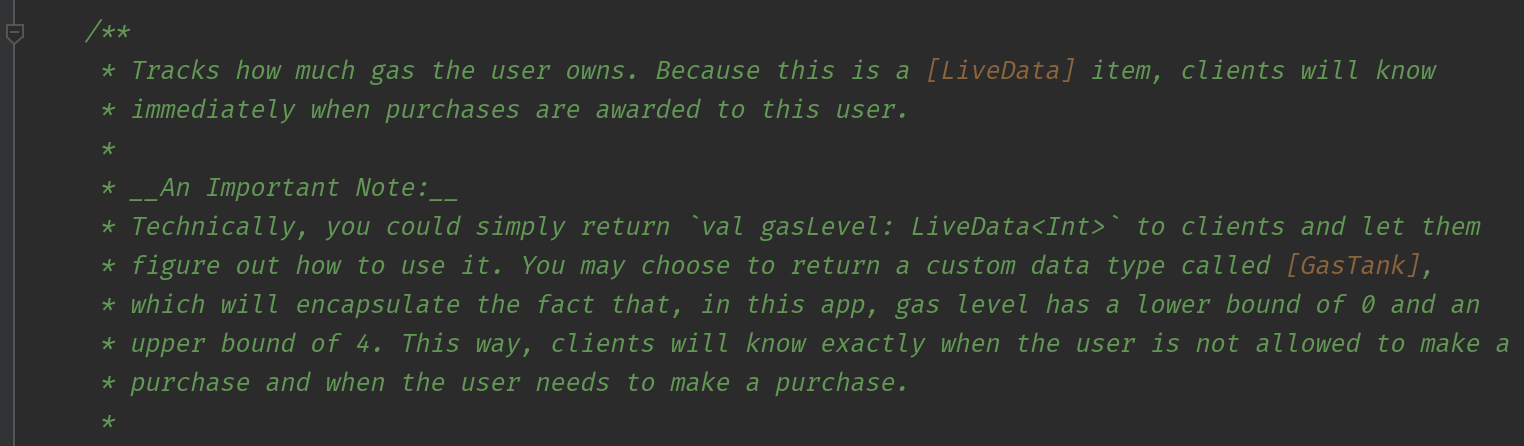 기술적으로 간단히`val gasLevel : LiveData <Int>`를 클라이언트에 반환하고 클라이언트가 사용 방법을 알아 내도록 할 수 있습니다.