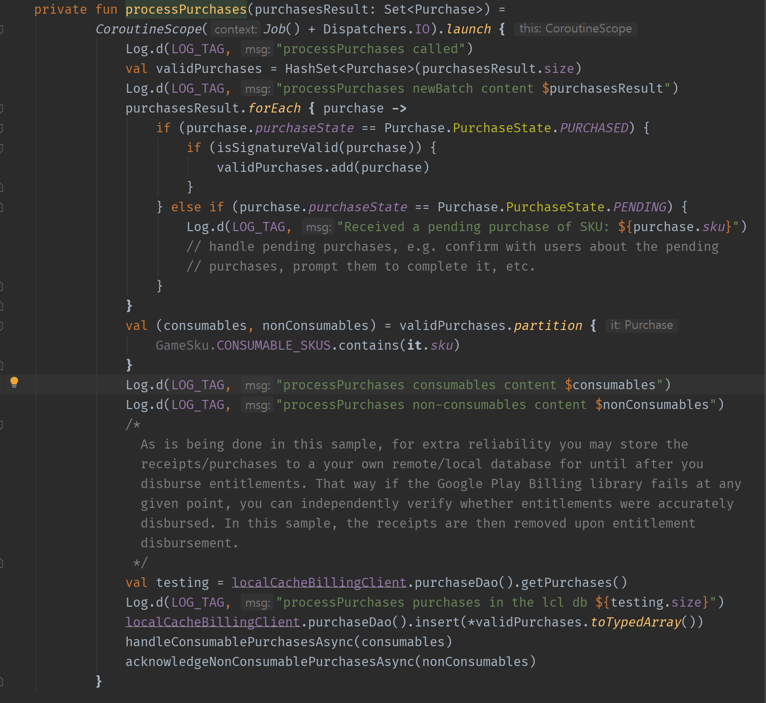 응답 코드가 [BillingClient.BillingResponseCode.OK]이면 개발자는 바로 [processPurchases]로 이동할 수 있습니다.