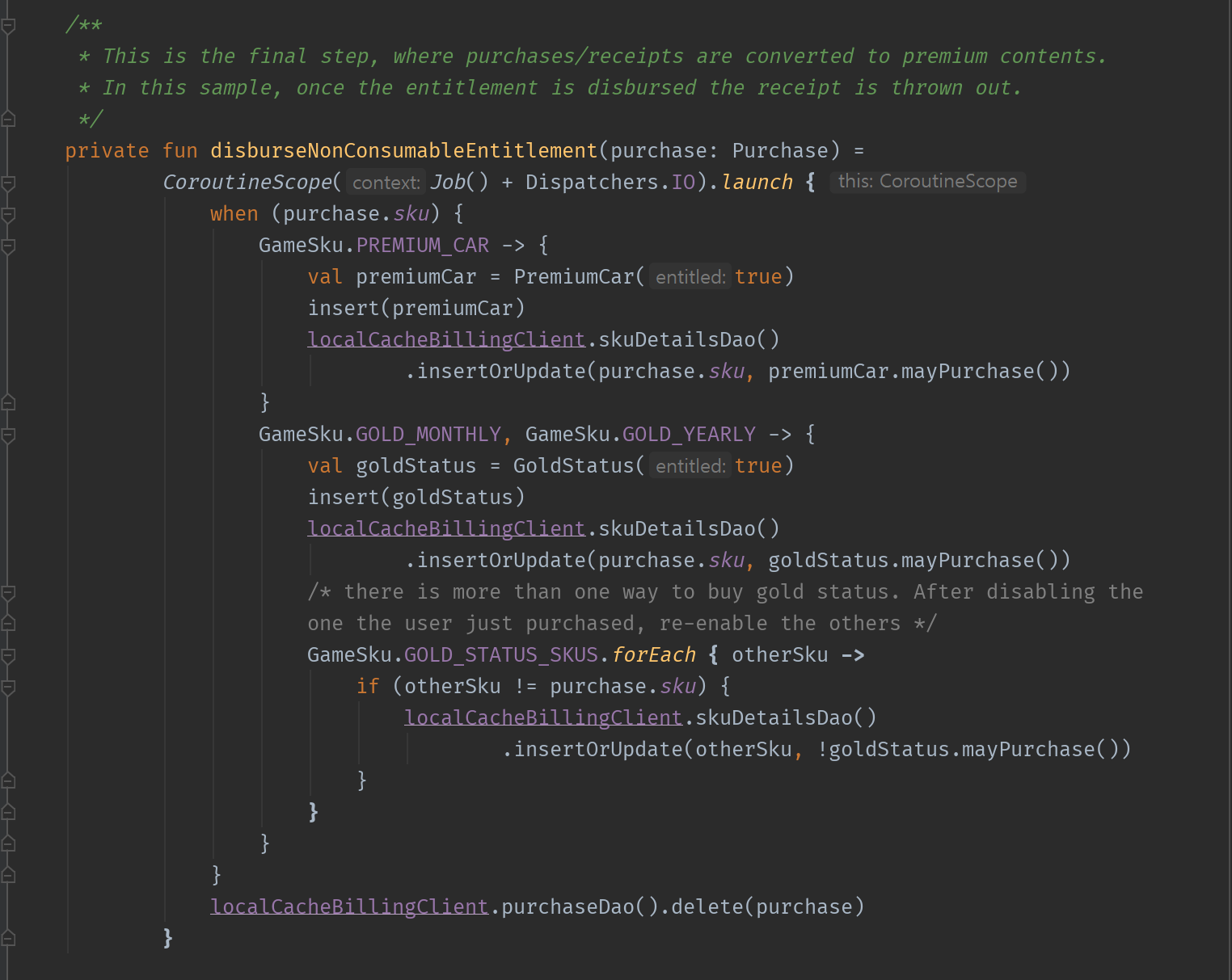 따라서 사용자가 무언가를 구매하면 Play Billing은 앱에게 [Purchase] 개체를 리턴하는데, 이것은 사용자에게 [Entitlement]를 릴리즈하는 데 사용한다.