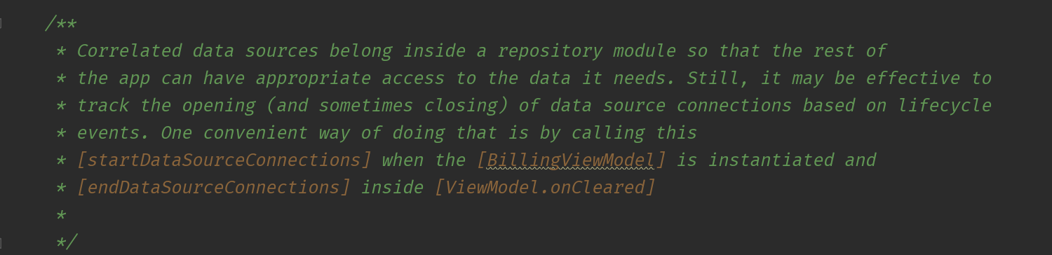 이렇게하는 한 가지 편리한 방법은 [BillingViewModel]이 인스턴스화 될 때, 이 [startDataSourceConnections]를 호출하고 [ViewModel.onCleared] 내에서 [endDataSourceConnections]를 호출하는 것입니다.