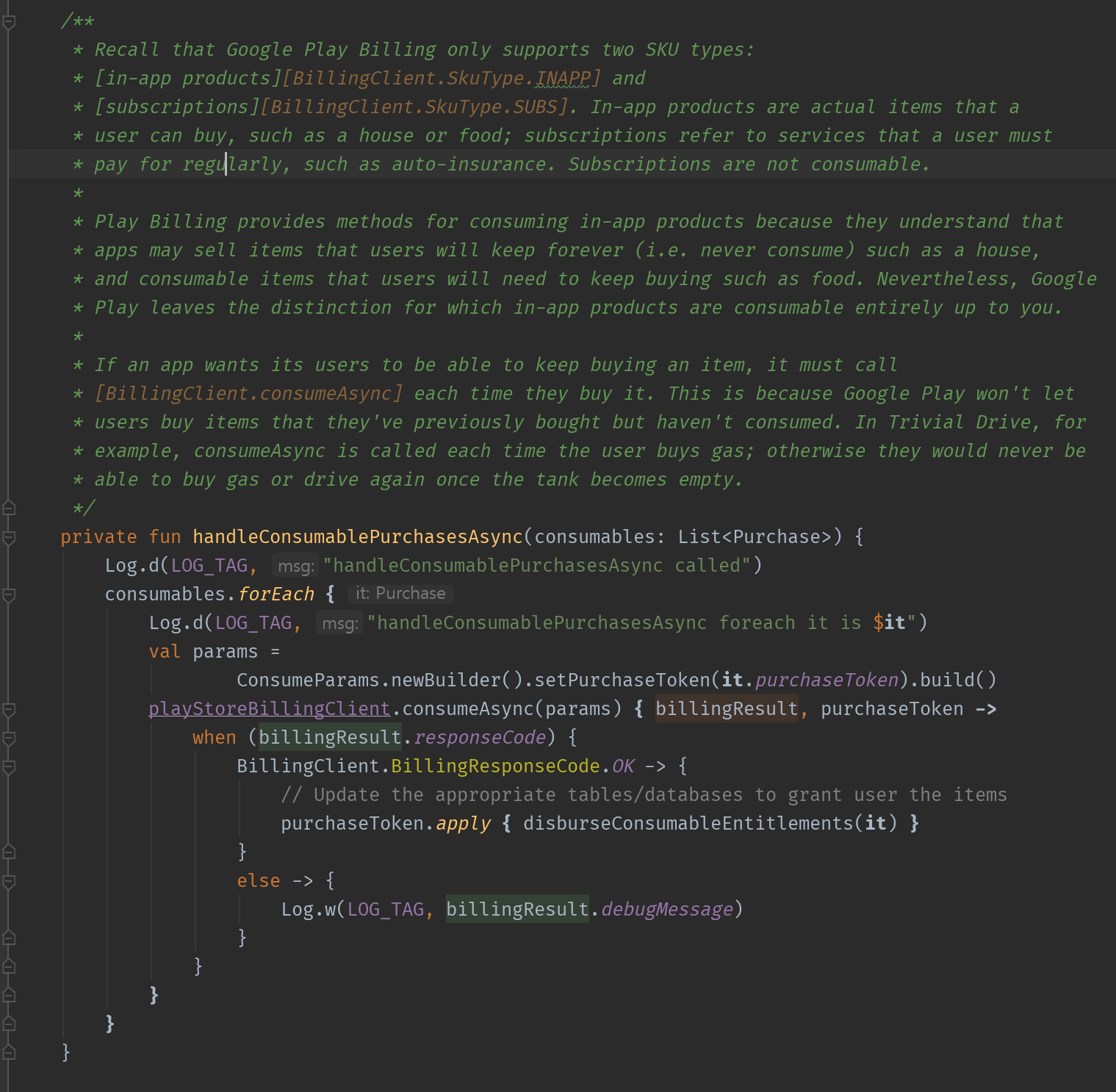 예를 들어 Trivial Drive에서는 사용자가 가스를 구입할 때마다 consumerAsync가 호출됩니다.