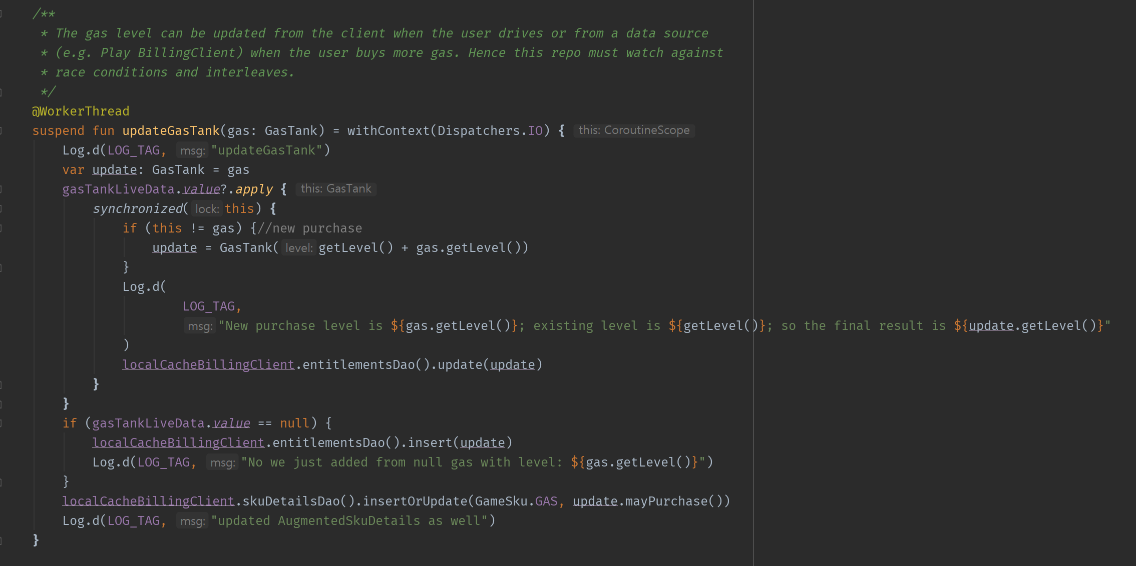 가스 레벨은 사용자가 운전할 때 클라이언트에서 업데이트하거나 사용자가 더 많은 가스를 구매할 때 데이터 소스 (예 : Play BillingClient)에서 업데이트 할 수 있습니다.