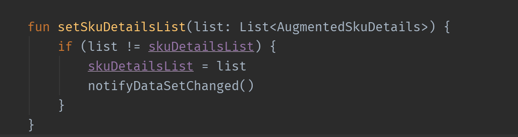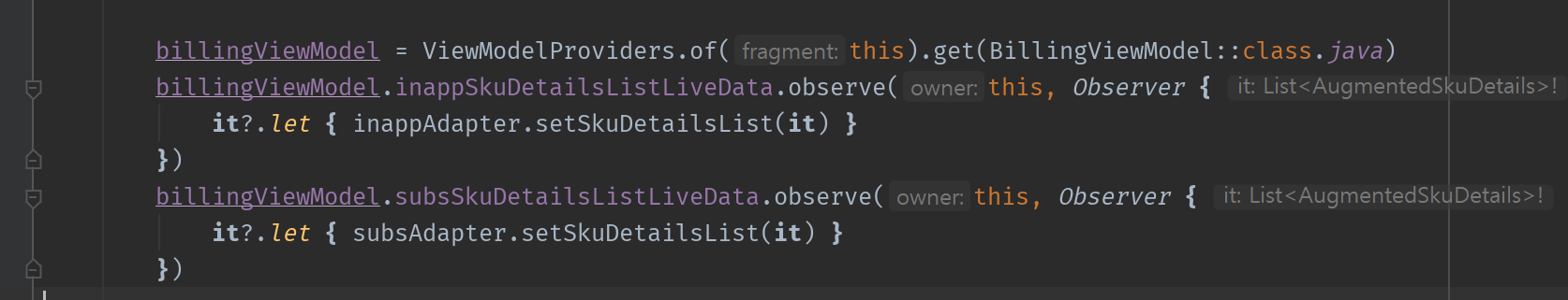 3> BillingViewMdoel을 뷰모델을 인스턴스 하고 inappSkuDetailsListLiveData, subsSkuDetailsListLiveData를옵저빙한뒤리스트가갱신되면 setSkuDetailsList메소드를동작시켜 업데이트해준다