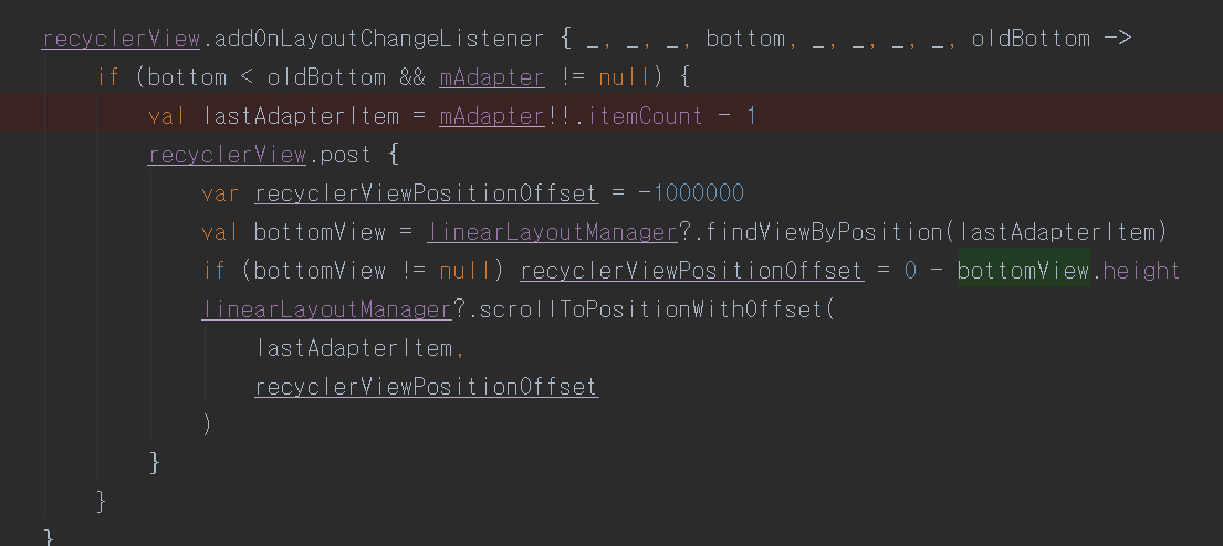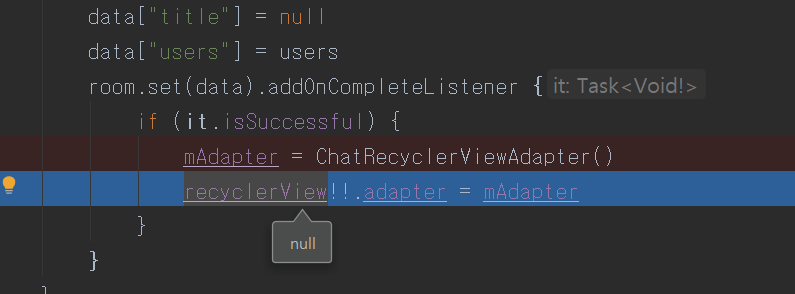 그것에 대한 처리는 위와 같다. mAdapter를 nullable하게 만들고 not null 일때 조건을 통과하도록 바꿔준다.