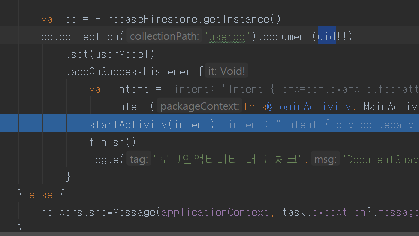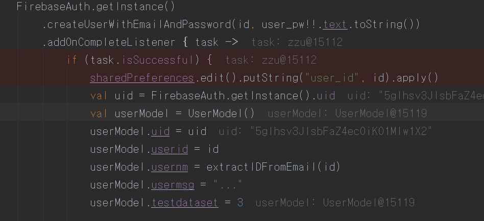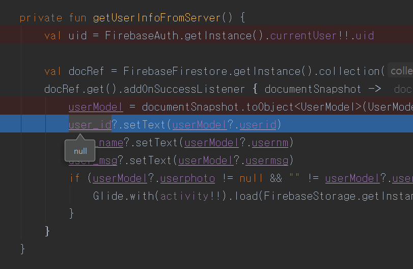 user_id를 입력하는 부분들이 null이여서 그렇다. 이를 해결해준다. 그 해결방법은 아래 textView를 주석처리해주면된다. 저 주석처리 된 부분을 살리고 싶으면 findViewbyId를 쓰면된다.