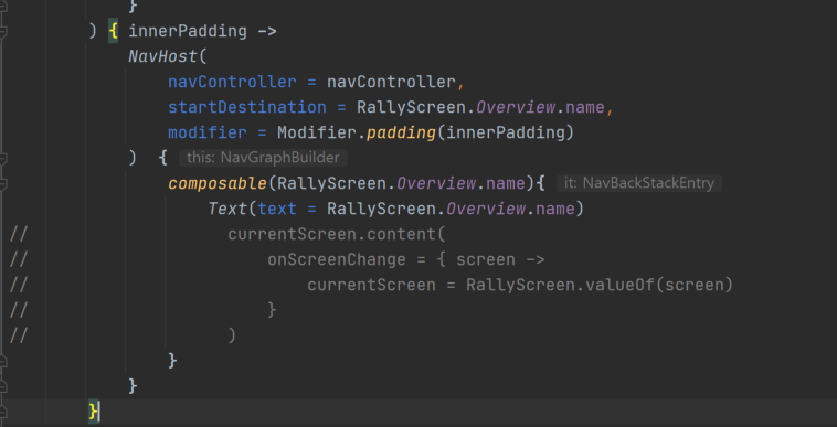 Go back to the RallyApp composable in RallyActivity.kt and replace Box containing the screen's contents with a newly created NavHost. Pass in the navController we created in the previous step. The NavHost also needs a startDestination. Set it to RallyScreen.Overview.name. Also, create a Modifier to pass the padding into the NavHost.