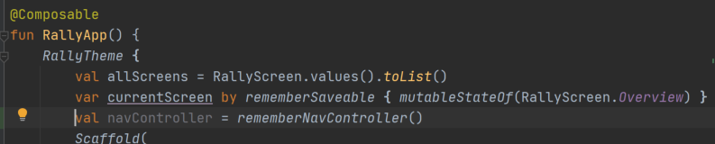 RallyApp안에 NavController 를 설정해준다. 이것이 composable의 root가 된다.
