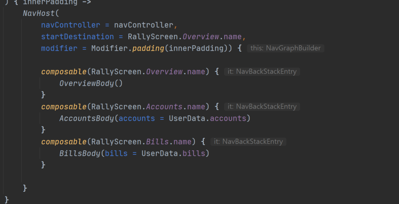 Open RallyScreen.kt. Move each screen's implementation of body into the corresponding composables within your NavHost in RallyApp.