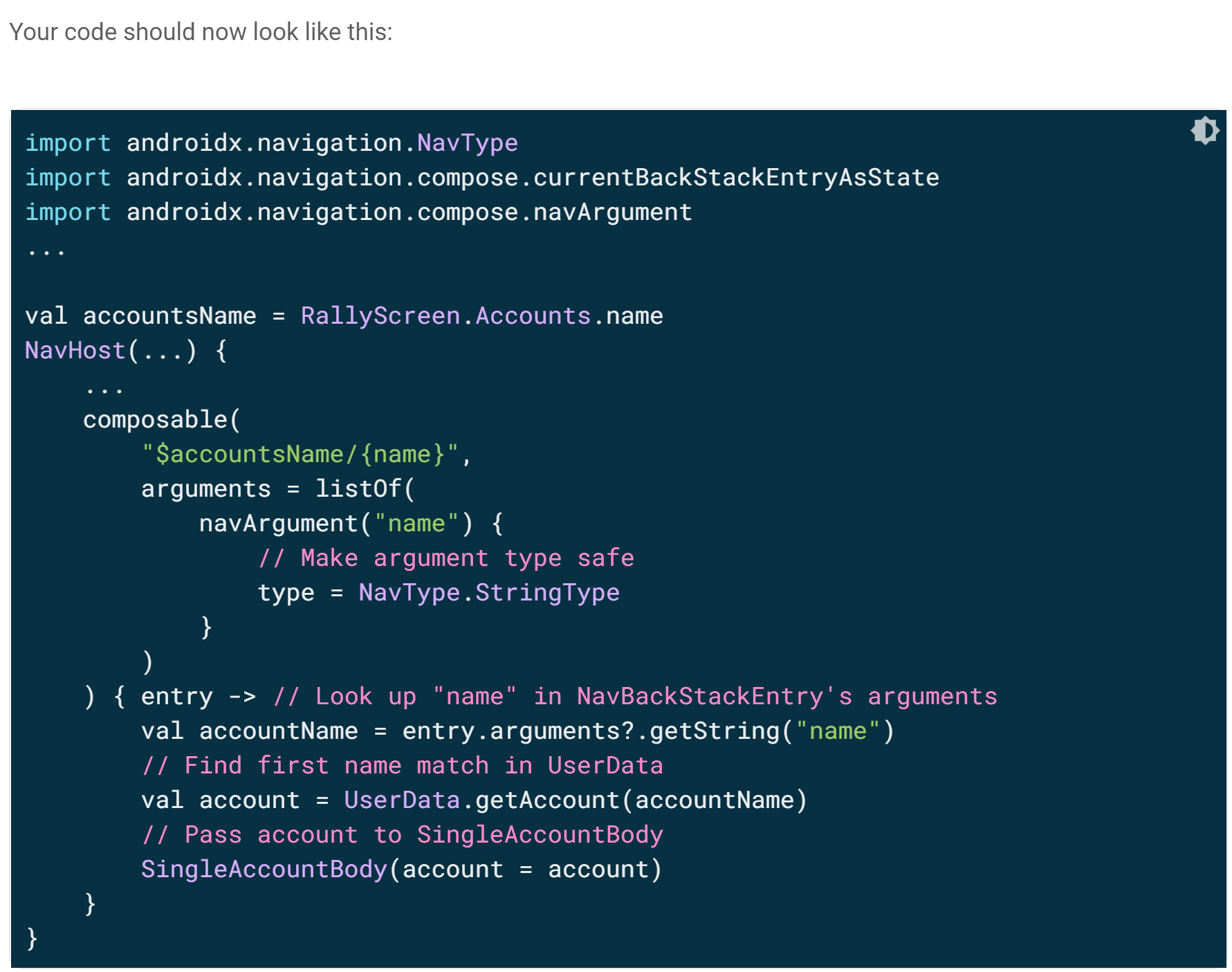 예를들어, 위 코드에서 arguments는 selected account의 이름과 같은 것을 retrieve하는데 사용할 수 있으며, UserData를 보고 SingleAccountBody composable에 전달한다.