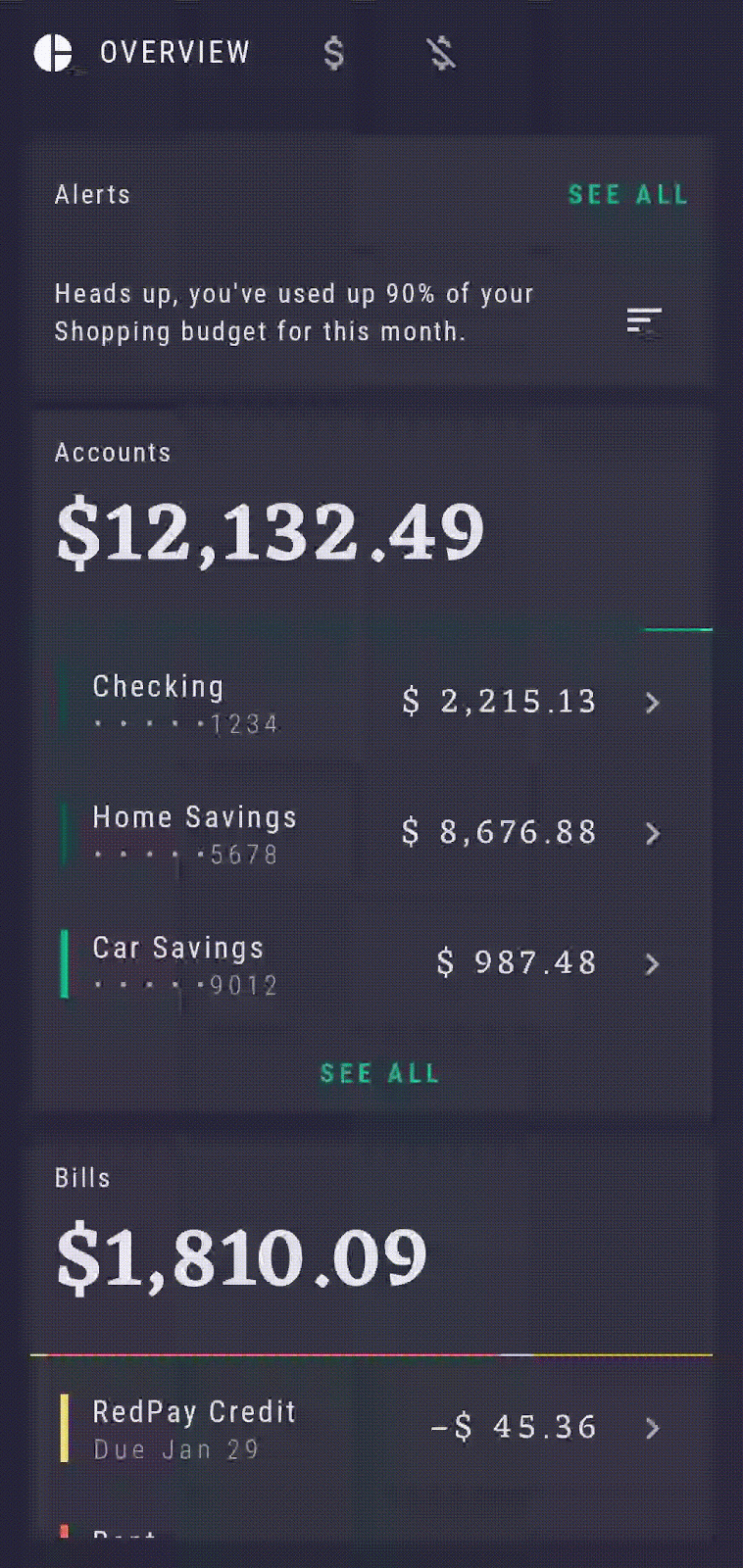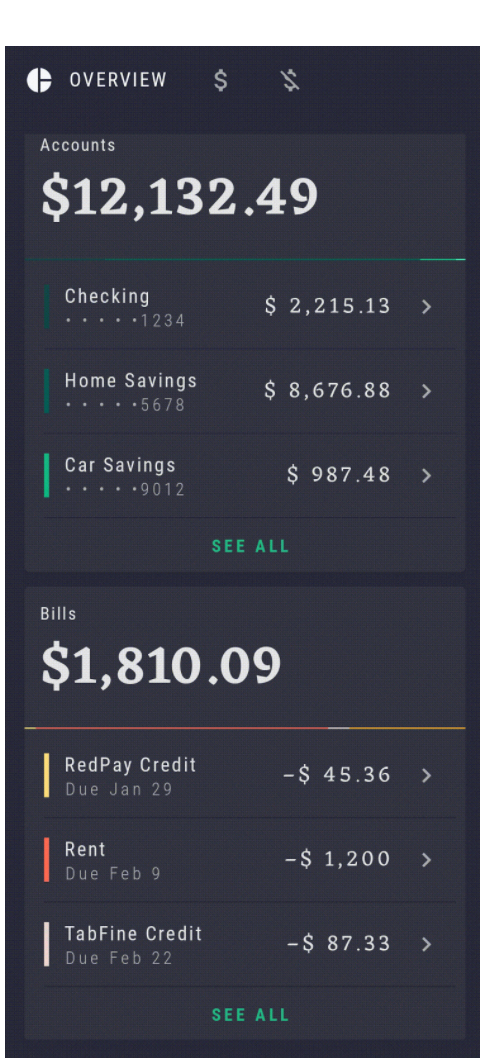 OverviewBody can accept several functions as callbacks to click events. Let's implement onClickSeeAllAccounts and onClickSeeAllBills to navigate to relevant destinations.