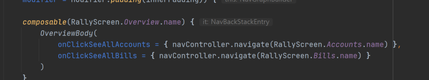onClickSeeAllAccounts = { navController.navigate(RallyScreen.Accounts.name) },