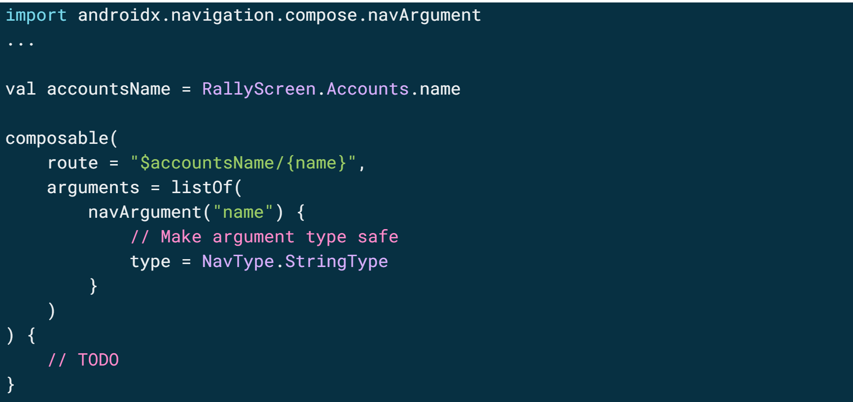 Now that the composable is set up with the argument, you can navigate to it, using the navController like this: navController.navigate("${RallyScreen.Accounts.name}/$accountName").