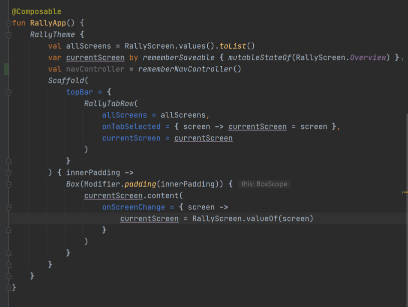 // var currentScreen by rememberSaveable { mutableStateOf(RallyScreen.Overview) }