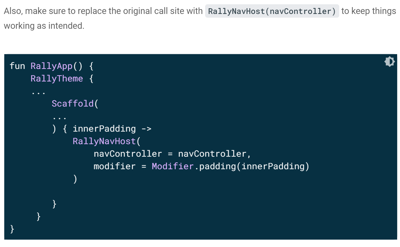 RallyNavHost를 만들어서 navController를 직접 만들지 않으면서도 higher 구조에서 RallyApp을 포함시킬수 있도록 만들 수 있다.