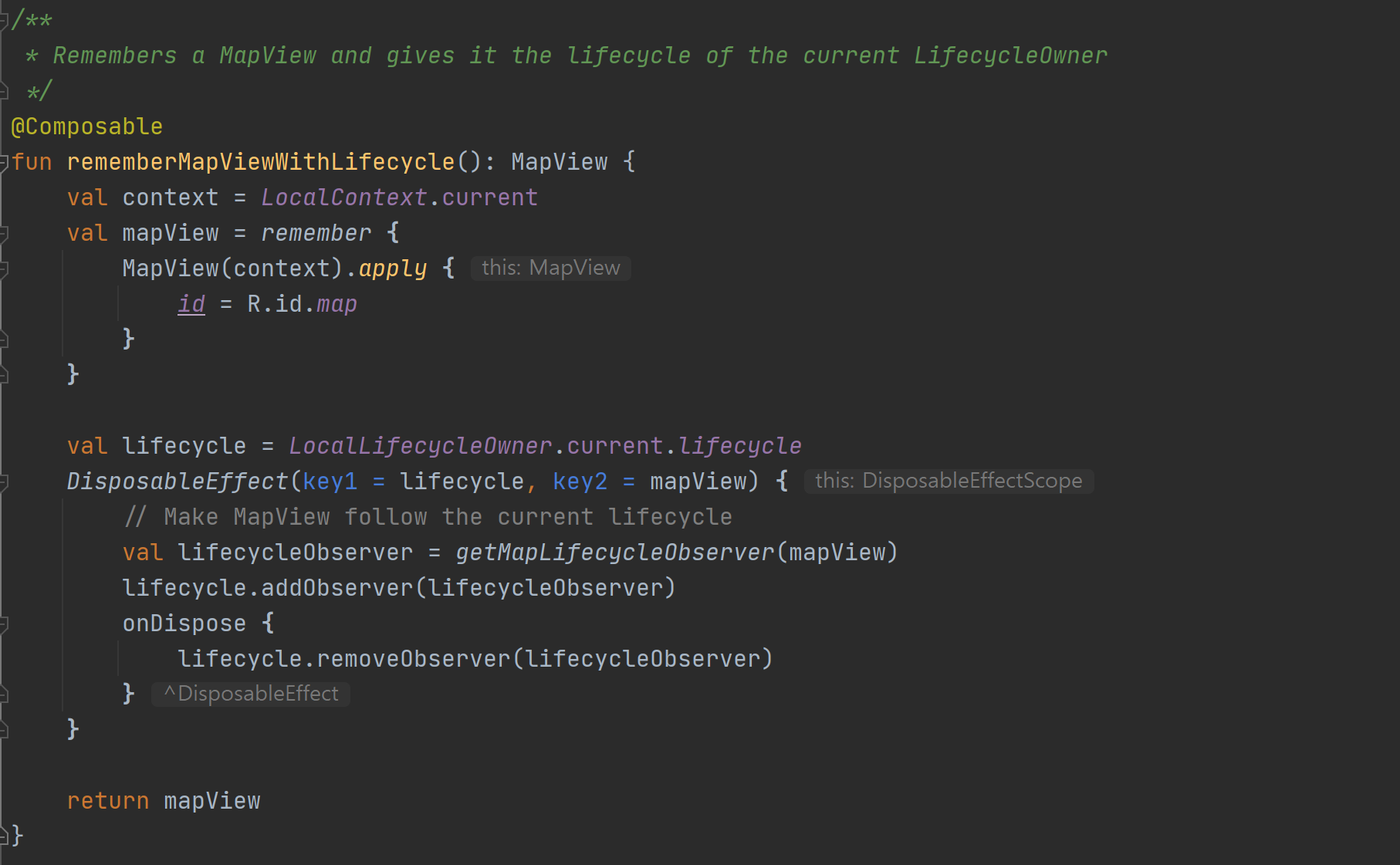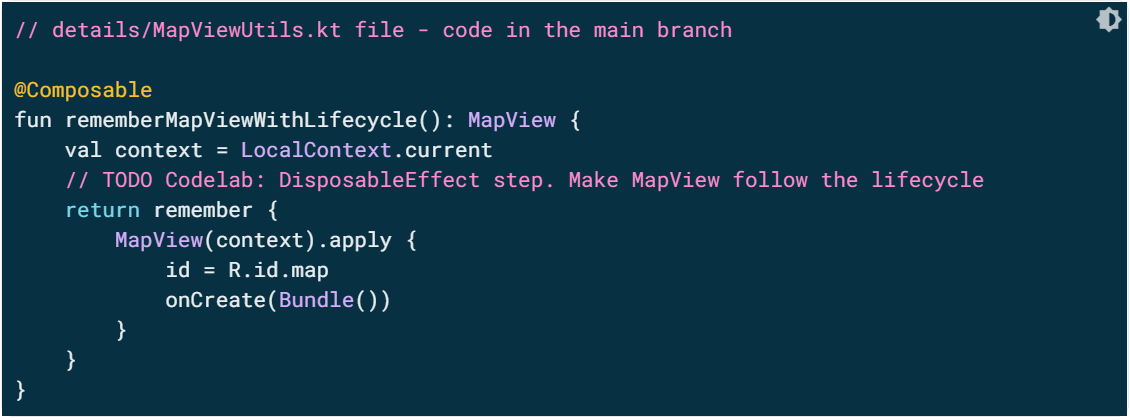 DisposableEffect는 키가 변경되거나 컴포저블이 컴포지션을 종료하면 정리되어야 하는 부작용을 위한 것입니다. 최종 rememberMapViewWithLifecycle 코드가 정확하게 이 작업을 수행합니다. 프로젝트에 다음 줄을 구현합니다.