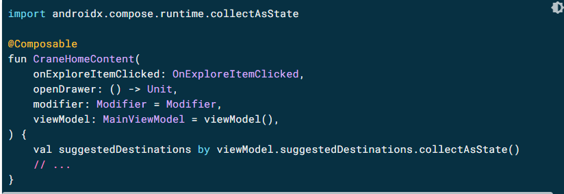 suggestedDestinations data stream 으로 newi item emit될때면 언제나 composable CraneHomeContent의 UI가 업데이트 되기를 원하므로 StateFlow.collectAsState() 함수를 사용하자.