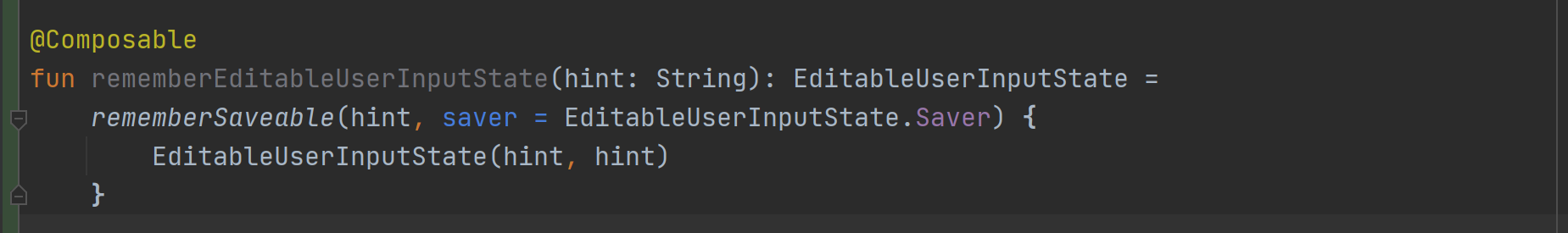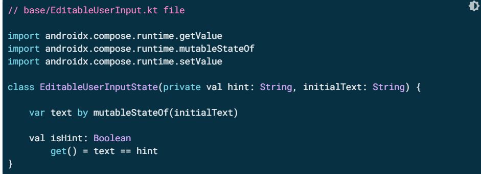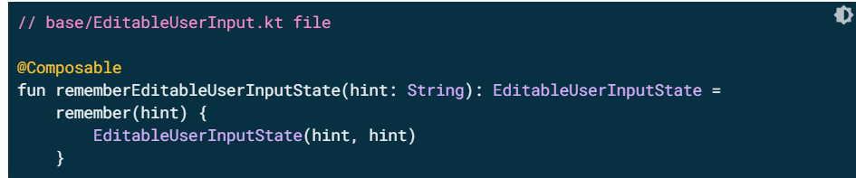 State holders always need to be remembered in order to keep them in the Composition and not create a new one every time. It's a good practice to create a method in the same file that does this to remove boilerplate and avoid any mistakes that might occur. In the base/EditableUserInput.kt file, add this code: