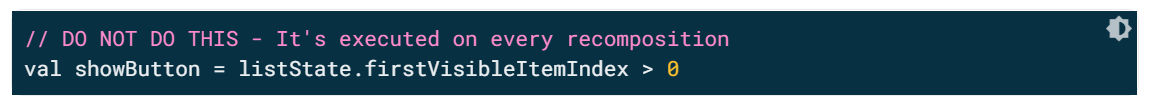 더욱 효과적이고 효율적인 대안은 listState.firstVisibleItemIndex가 변경될 때만 showButton을 계산하는 derivedStateOf API를 사용하는 것입니다.