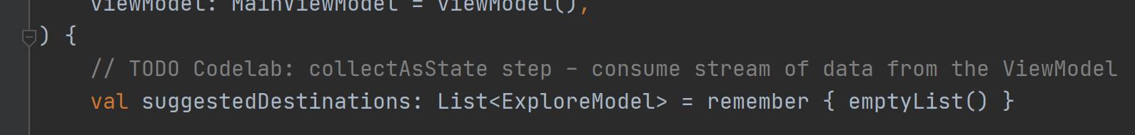 home/MainViewModel.kt을 열고 suggestedDestinations 를 확인하면 updatePeople이나 toDestinationChanged 함수가 get called 될때 stateFlow가 update될것임을 알 수 있다.