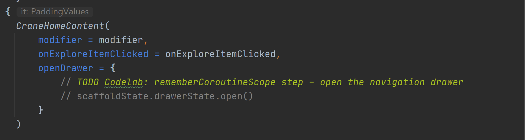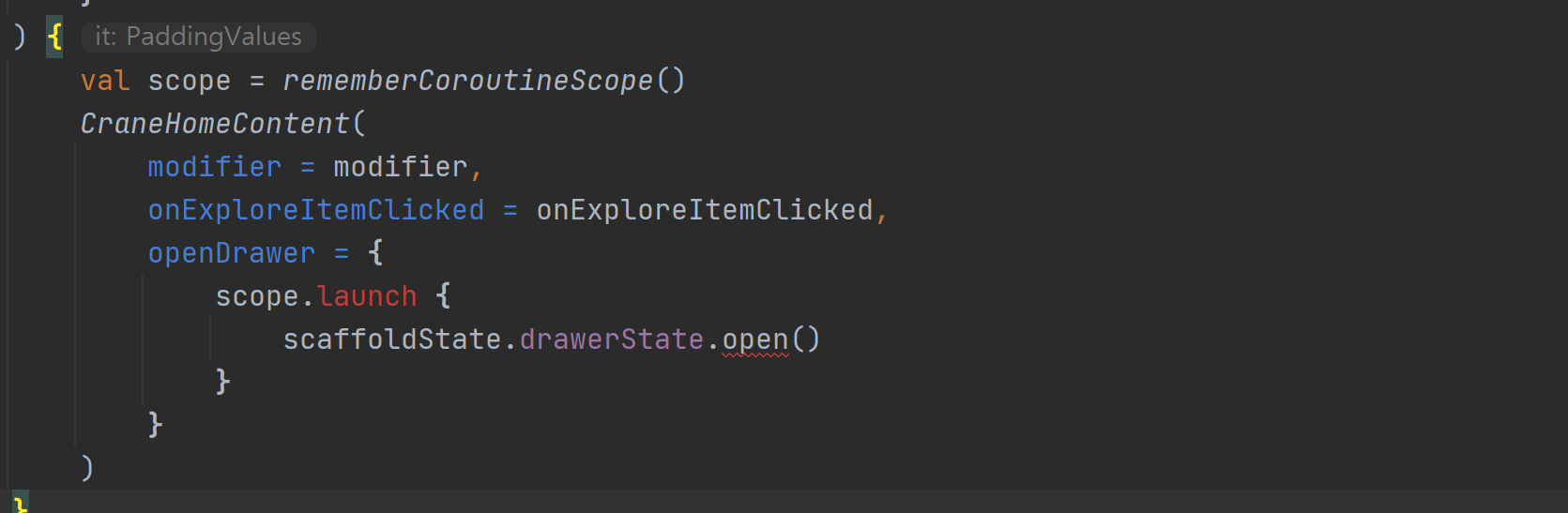 In CraneHome, we have a scaffoldState that contains a DrawerState. DrawerState has methods to open and close the navigation drawer programmatically. However, if you attempt to write scaffoldState.drawerState.open() in the openDrawer callback, you'll get an error! That's because the open function is a suspend function. We're in the realm of coroutines again.