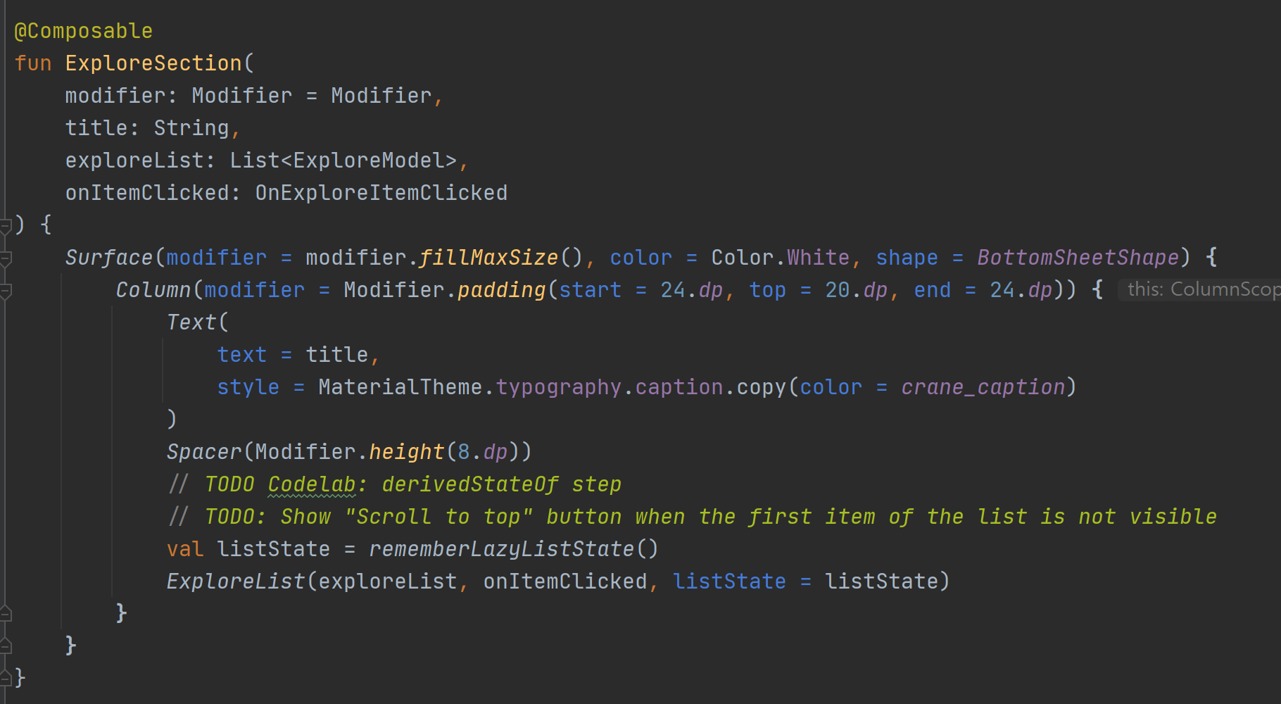 이 코드가 포함된 base/ExploreSection.kt 파일을 엽니다. ExploreSection 컴포저블은 Scaffold의 배경에 표시되는 컴포저블에 해당합니다.