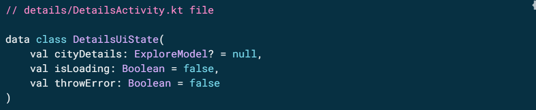 화면의 상태를 모델링하는 한 가지 방법은 화면에 표시할 데이터, 로드 및 오류 신호와 같은 모든 가능성을 다루는 클래스를 사용하는 것입니다. DetailsActivity.kt 파일에 DetailsUiState 클래스를 추가합니다.