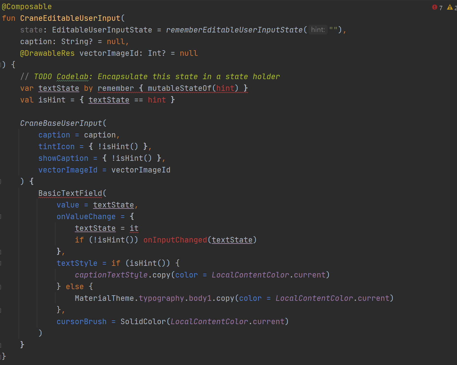 The logic to update the textState and determine whether what's been displayed corresponds to the hint or not is all in the body of the CraneEditableUserInput composable. This brings some downsides with it: